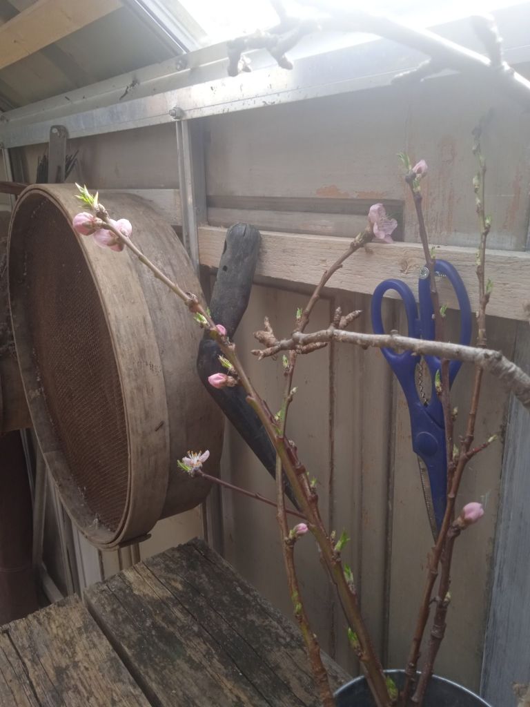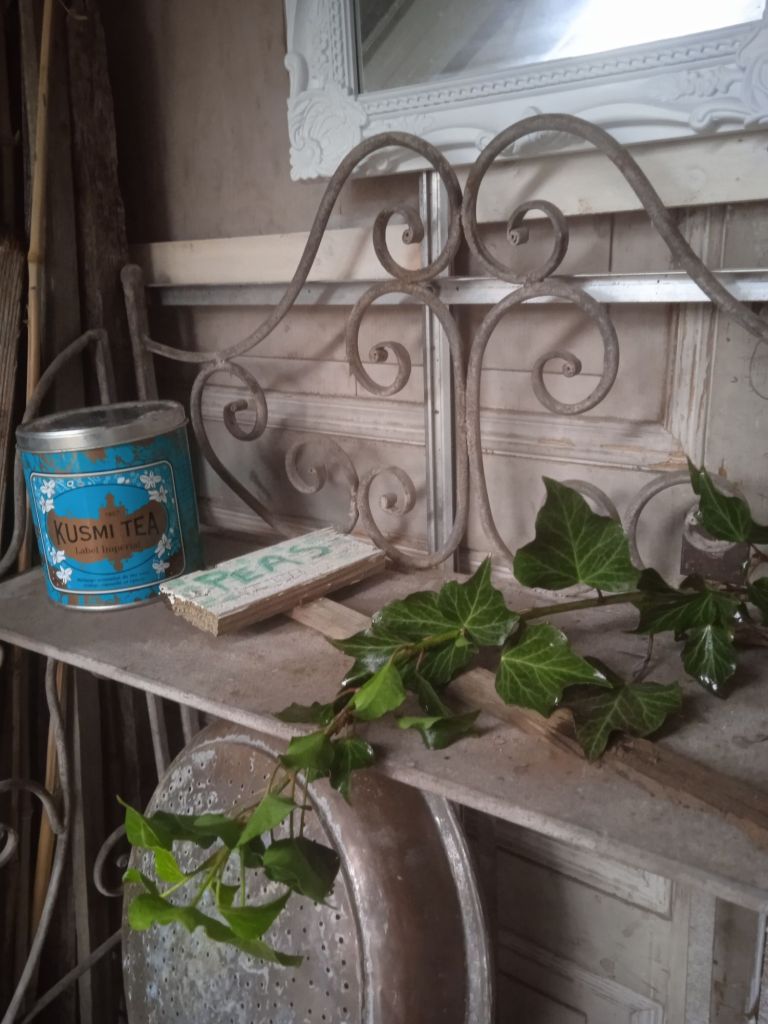 Les pots sont rangés sous la petite table de rempotage, prêts à être remplis avec les jeunes pousses de printemps. Les sécateurs et les gouges défilent, accrochés à les jolies parois en bois blanchi.