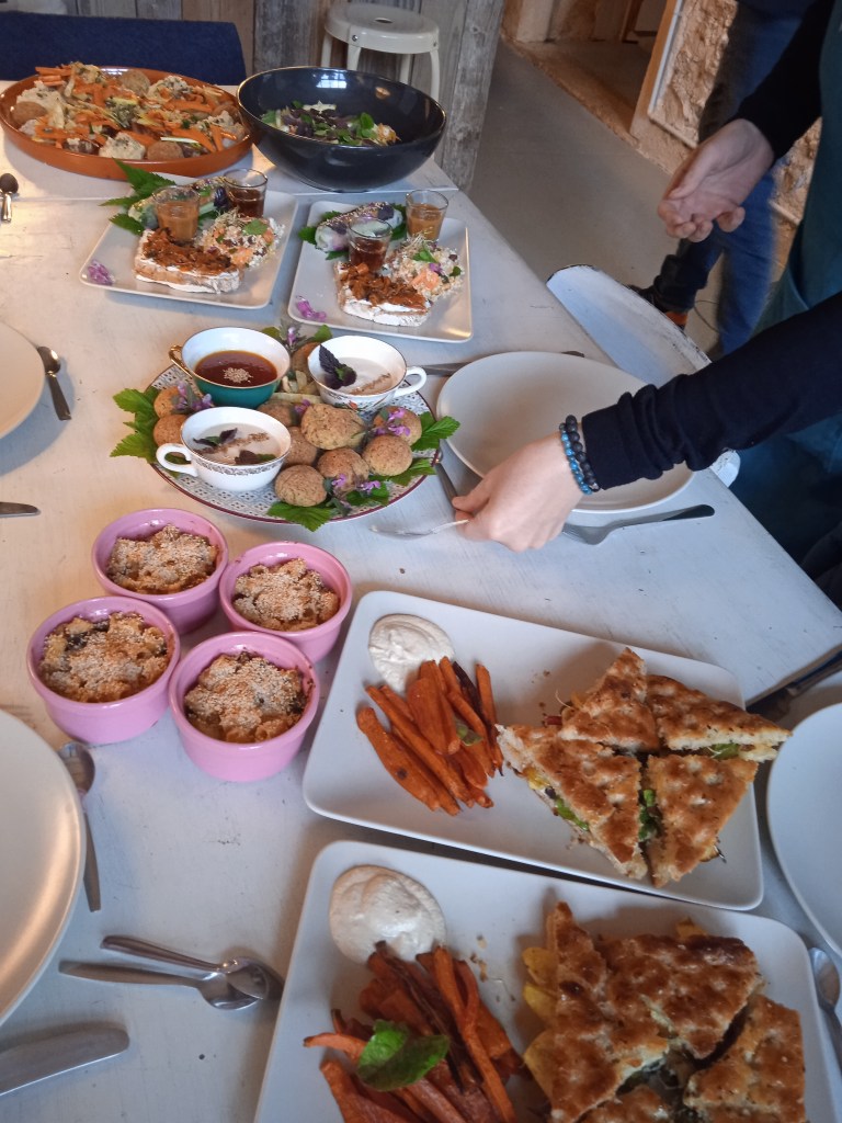 Exemples de préparations : salade de petit épeautre et pois-chiches croquants, légumes grillés et les sauces qui vont avec, tofu ou tempeh à la méditerranéenne / à la bourguignonne/ à l’asiatique (selon l’envie et la saison), dessert végétal
